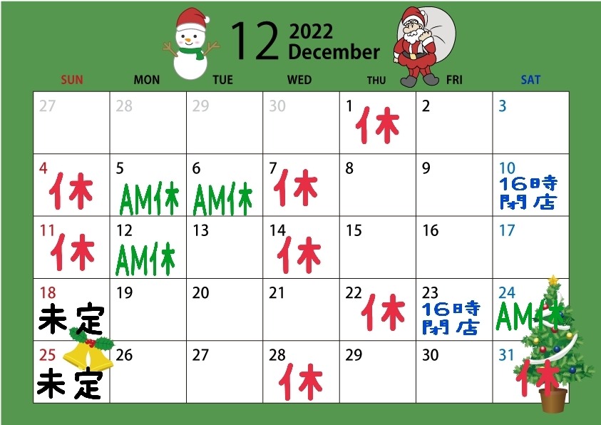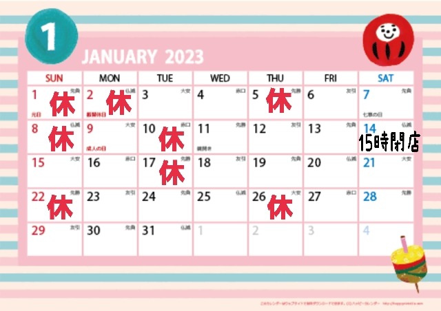 1月のスケジュールですが、日曜日の営業日まだどうするか未定ですのでご予約の際ご確認ください。